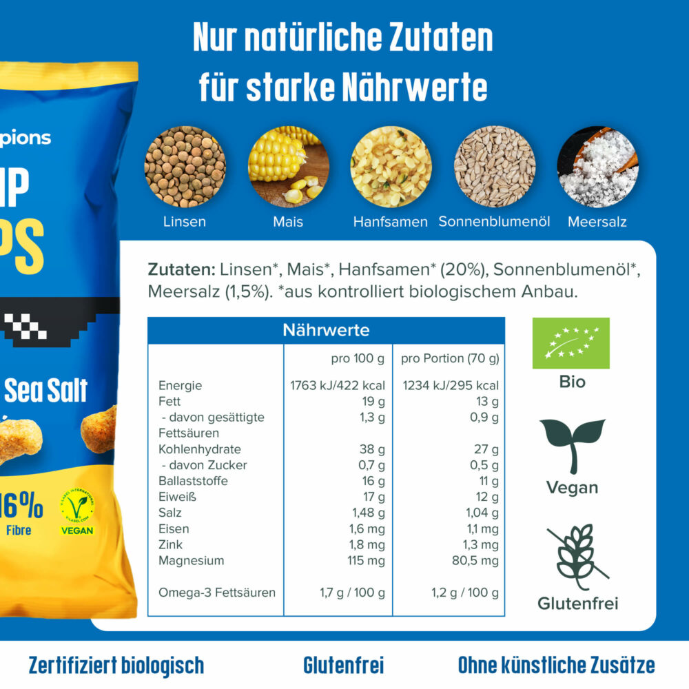 Unsere Hemp Flips Sea Salt bestehen aus 100% natürlichen Bio Zutaten, allen voran Linsen, Mais und stolzen 20% Hanfsamen. Das sorgt für den perfekten Mix aus starken 17% Protein, 16% Ballaststoffen und dafür weniger Fett und Kohlenhydraten wie in anderen Snacks.