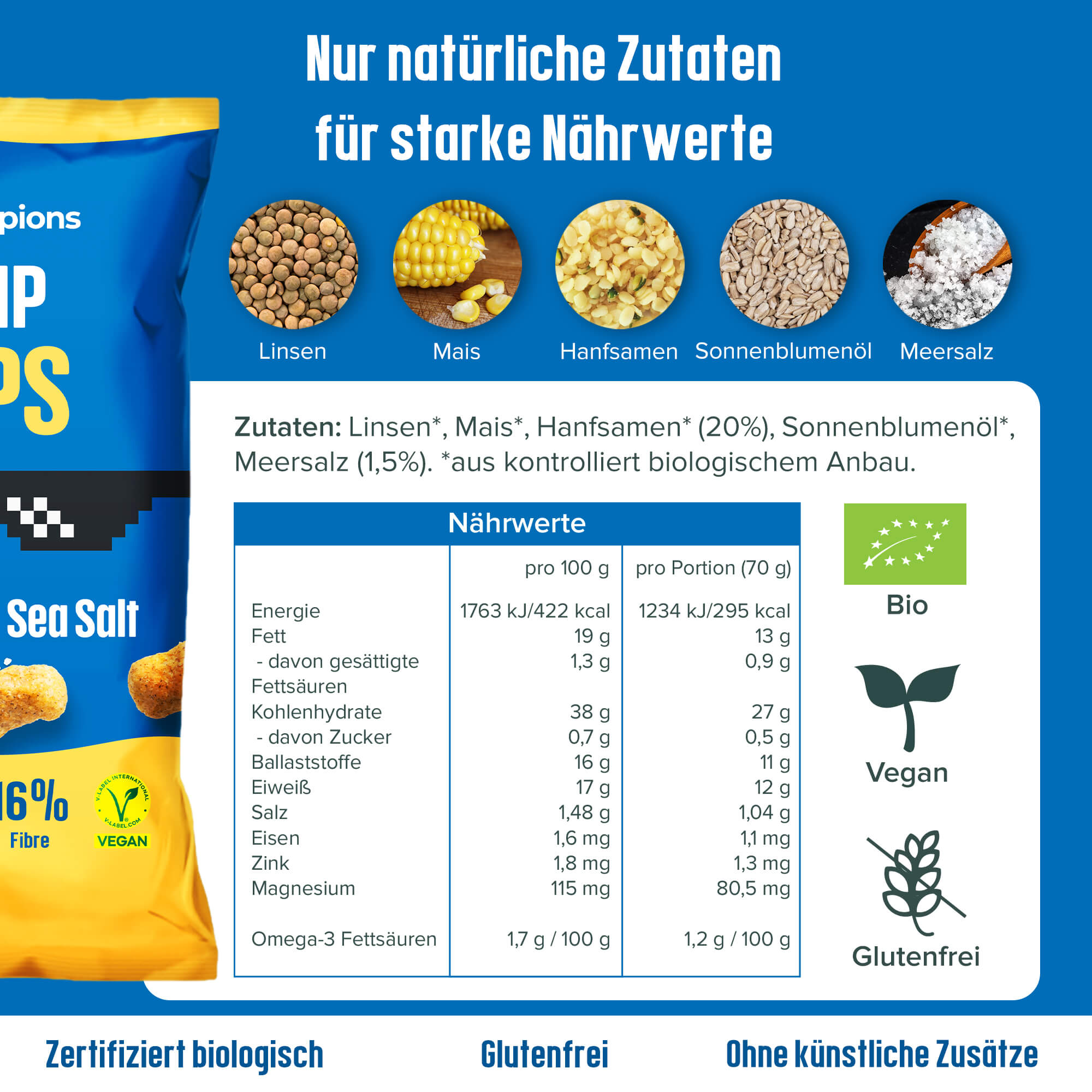 Linsen*, Mais*, Hanfsamen* (20%), Sonnenblumenöl*, Hefeflocken*, Reismehl*, Meersalz.