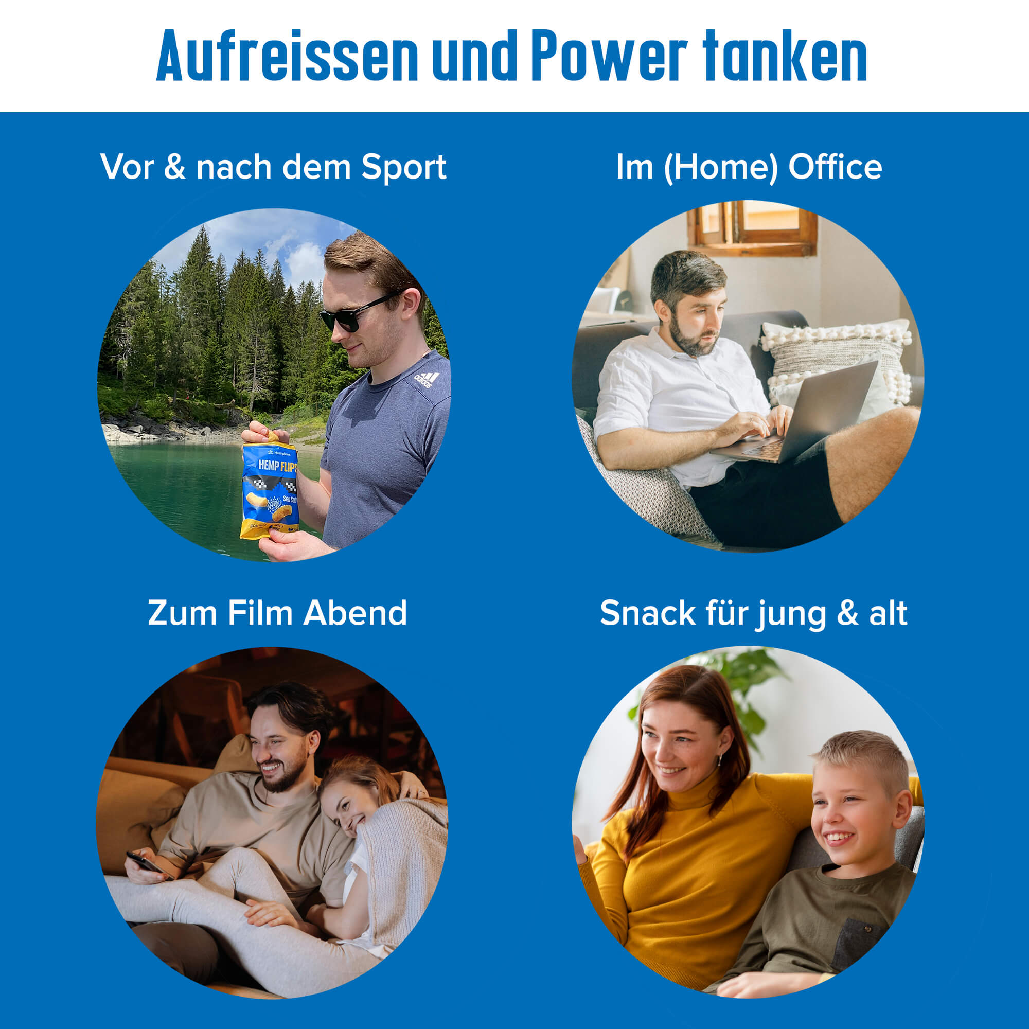Hemp Flips eignen sich sowohl als Energielieferant vor dem Sport (bis etwa 1 Stunde vor Trainingsbeginn), als auch nach dem Sport, um die Muskeln mit Energie, Eiweiß und Magnesium zu versorgen. Während langer Arbeitstage oder bei ausgedehnten Aktivitäten wie Wandern oder Radfahren, liefern sie kontinuierlich Energie und halten den Blutzuckerspiegel konstant.